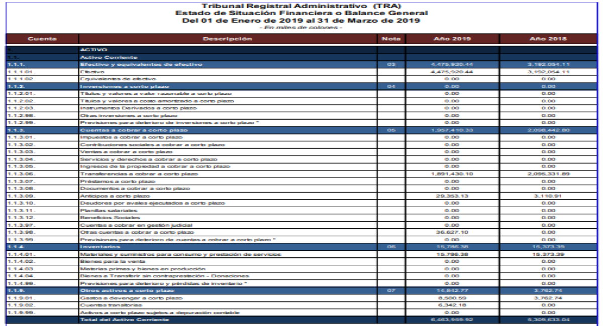 Que adicionalmente se indica que el Tribunal se encuentra al día con la presentación de los Estados Financieros del Primer Trimestre del Año 2019, mismos que fueron enviados a la Contabilidad Nacional el pasado 30 de abril de 2019 y que se encuentran debidamente publicados en nuestro sitio web del Tribunal en el link: https://www.tra.go.cr/listado-de-estados-financieros